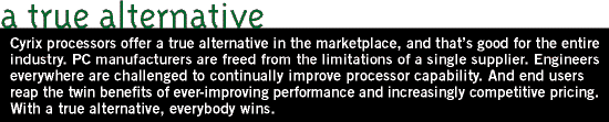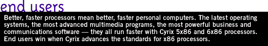 They also become less dependent on the pricing and product line of a single, dominant supplier and stand to benefit from the competition. Any dominance of the x86 processor industry inhibits freedom of choice and free enterprise. Cyrix aims to change this state of affairs -- for our customers who make computers and their customers who use them. With genuine competition among processor suppliers, the result for end users will be higher performance computers available at competitive prices.