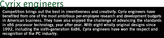 Since Cyrix was founded in 1988, our engineers have thrived on the challenge of beating the best designs available in the market. The original architecture of the 6x86 is testament to the motivating power of competition. Now that Cyrix is setting performance standards rather than responding to them, the company looks forward to continuing to advance the standards.