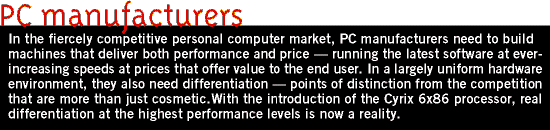 For PC makers the message is clear -- those who want to bring to market systems that run existing and future applications at peak levels can now, for the first time, look beyond the industry's dominant processor supplier. In a homogenous hardware environment, the Cyrix 6x86 offers PC makers an immediate, high-level means of product differentiation -- the 6x86 plugs easily into the Pentium infrastructure. But with the 6x86 family, Cyrix processors are more than just acceptable performance alternatives for Pentium-class systems. When it comes to running today's most popular applications, Cyrix 6x86 processors are setting performance standards.